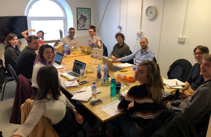 The main production team for Polybius Heist. Clockwise from the lady facing away from camera in the bottom left: Make-up Assistant, Make-up Designer, Production Co-ordinator, Costume Designer, Production Assistant, Director, First Assistant Director, Associate Producer, Line Producer, My empty chair as I was taking this photo, Director of Photography, Gaffer, Production Designer. Not pictured: Sound Engineer.