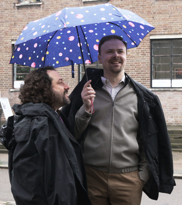 Ashens and Benny studiously ignore the incongrous pink streamers.
