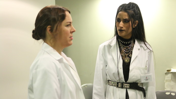Christine (played by Joanna) on the left talks to the coolest scientist ever.