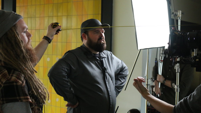 Jarred Christmas undergoes a heavy hat-measuring from 1st Assistant Camera / Focus Puller Bradley.