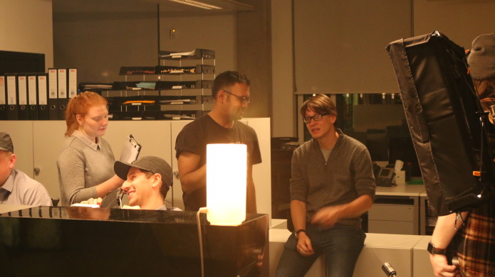 Director Riyad and Director of Photography Christian talk shot composition, while script supervisor Esther keeps an eye on their limbs for continuity.